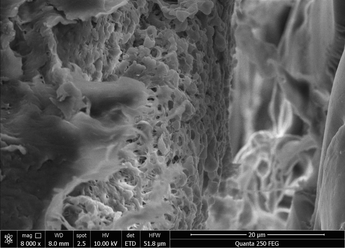 圖四 電鏡下氣體分離膜支撐層的微孔結(jié)構(gòu)(照片由南京碳環(huán)生物質(zhì)能源有限公司提供)