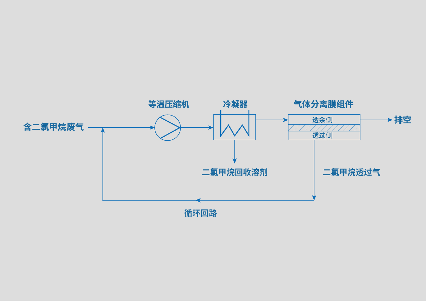 經(jīng)壓縮后的二氯甲烷有機廢氣進入冷凝器,氣體中的一部分二氯甲烷被冷凝下來,回收后的二氯甲烷溶液可以再次使用。而未冷凝的二氯甲烷氣體進入氣體分離膜組件,在壓力差的推動下,二氯甲烷透過膜,透余氣為脫除二氯甲烷后的氣體,通常為空氣。透過氣中富含二氯甲烷有機氣體,該氣體循環(huán)至壓縮機的進口進行復(fù)疊處理。由于二氯甲烷在循環(huán)回路中的濃度逐步上升,壓縮后進入冷凝器的二氯甲烷達到凝結(jié)濃度,二氯甲烷又被冷凝下來,成為可以被利用的液態(tài)二氯甲烷溶劑。