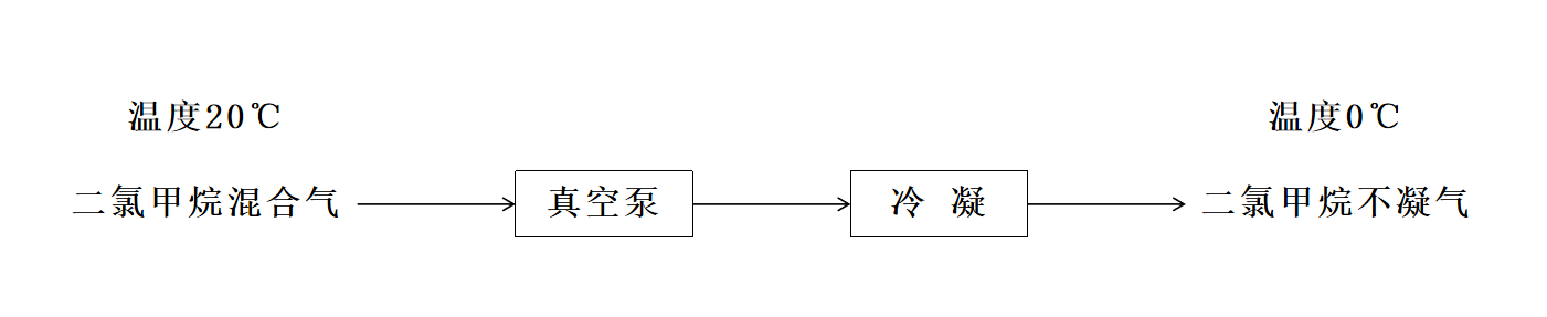 以二氯甲烷和空氣的混合氣為例:20℃時二氯甲烷的飽和蒸氣壓是47.39KPa,由公式(2)計算可知,此時二氯甲烷在混合氣中的含量約為46.8%??紤]到真空泵前后的氣體壓力變換不大,將該混合氣降到0℃。0℃時二氯甲烷的飽和蒸氣壓是19.2KPa,二氯甲烷在混合氣中的比例約為18.9%。由此可以看出,采用圖(1)所示的流程,將二氯甲烷和空氣的混合氣由20℃降為0℃,約有74%的二氯甲烷冷凝析出變?yōu)橐后w溶劑。但是仍有26%的二氯甲烷不凝氣體隨混合氣體進入后續(xù)廢氣處理裝置。