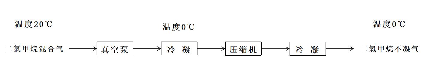 在VOCs源頭回收治理中,我們采用了“等溫壓縮”的工藝,即在真空泵之后,配置壓縮機,將0℃的二氯甲烷混合氣體的壓力由一個大氣壓,增加到九個大氣壓,即表壓800KPa。然后再將該混合氣體冷到0℃,見圖(2)壓縮+冷凝流程示意圖。